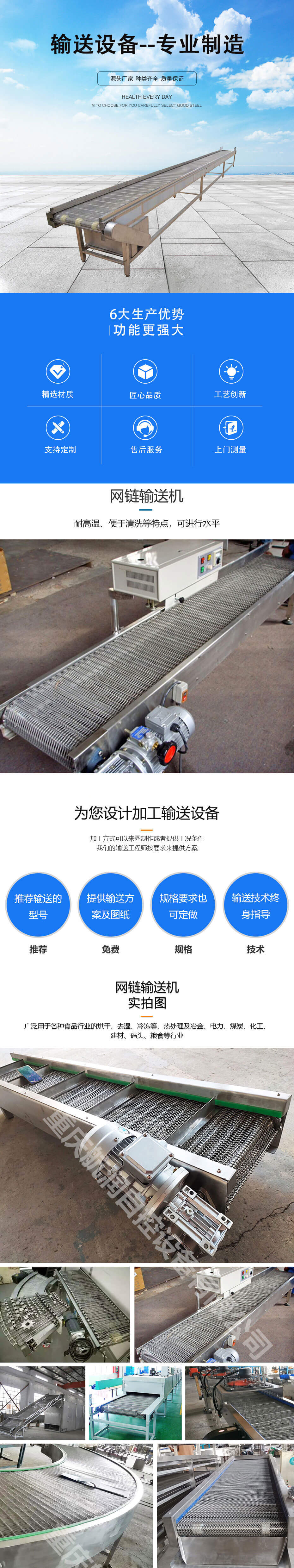網(wǎng)鏈輸送機采用不銹鋼網(wǎng)帶作為載體,具有耐高溫、便于清洗等特點,可進行水平、傾斜和垂直輸送,也可組成空間輸送線路,輸送能力大,運行可靠、工藝布置靈活、還可在輸送過程中同時完成若干工藝操作; 廣泛用于各種食品行業(yè)的烘干、去濕、冷凍等、熱處理及冶金、電力、煤炭、化工、建材、碼頭、糧食等行業(yè)。